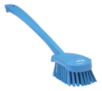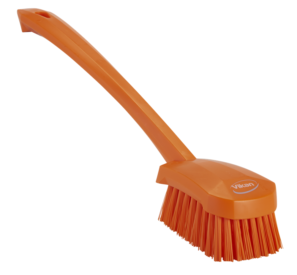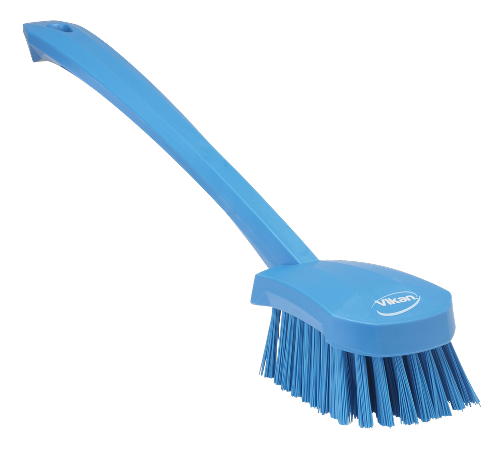 Det långa skaftet på denna borste gör det möjligt att komma åt på svåråtkomliga ytor. De vinklade hårda filamenten fungerar bra för rengöring på avstånd, t ex på rengöringsmaskinger, i hinkar, baljor och annan utrustning där det krävs längre räckvidd.