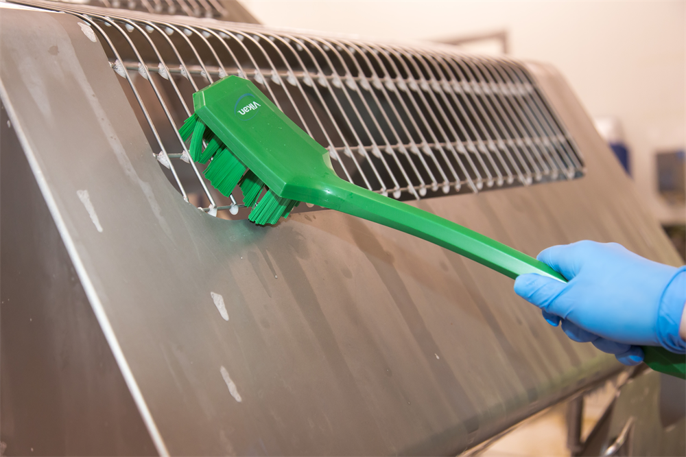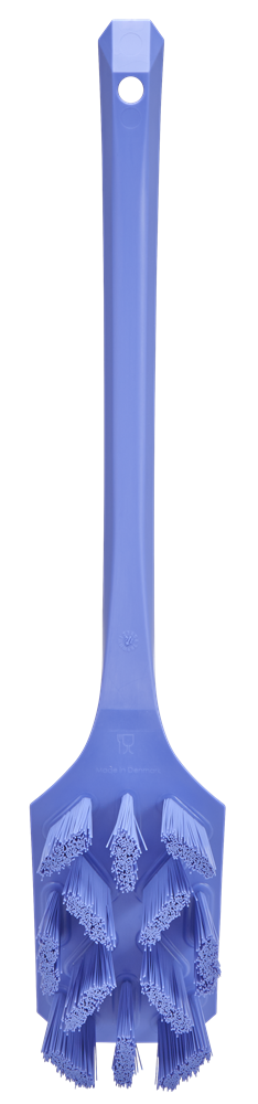 ULTRA SAFE TECHNOLOGY långskaftad handborste med styva filament, för maximal hygien vid rengöring av maskiner, hinkar, behållare och kar i hygienområden. Den vinklade och cirkulära utformningen av filamenten säkerställer effektiv rengöring.